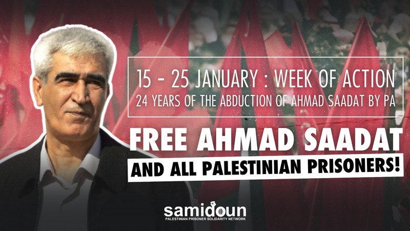 Samidoun Palestinian Prisoner Solidarity Network urges all who stand with Palestine — Palestine solidarity groups and collectives, Palestinian, Arab and Muslim community organizations, anti-imperialist organizations, political parties and liberation movements — to join between 15 and 25 January 2026 in a week of action to free Ahmad Sa’adat and all Palestinian prisoners in Zionist dungeons, in PA jails, and in the prisons of imperialist and reactionary regimes.